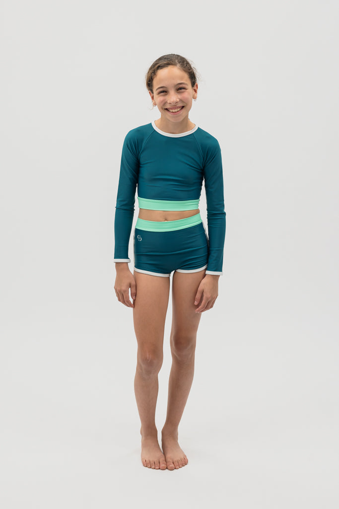 I bought this for my 13 year old daughter and she loves it. Every summer we have battles about wearing a rashie and sun protection. This rashie is a great colour and the cropped length is fun and stylish, while the full length arms give good sun protection.